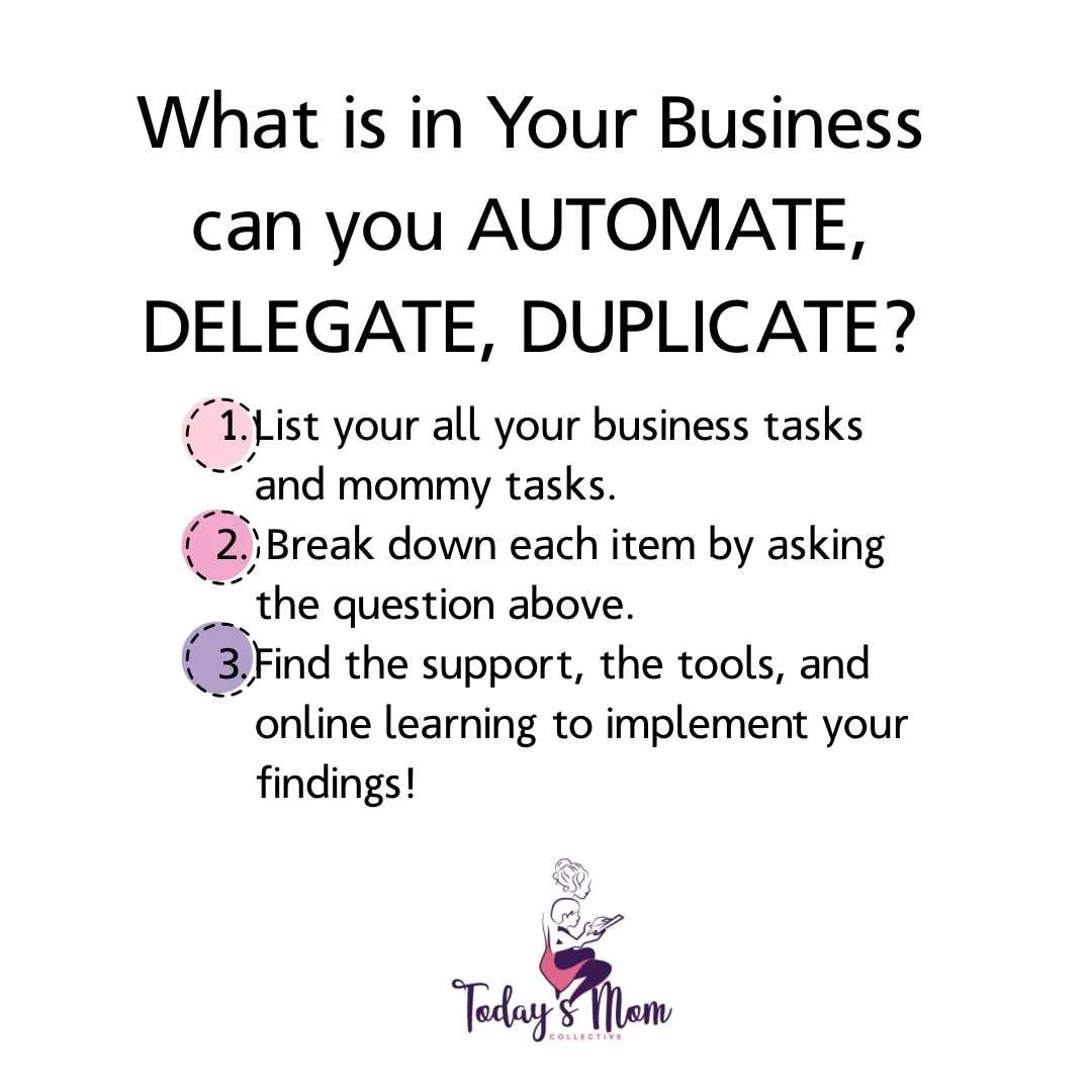 This will take a bit of time to figure out. My suggestion is to write two separate lists. One list will be all the items you need to do for your business to keep it running. The other will be a list of the tasks you do as a mother. It can be overwhelming at first but once you have completed it, you can categorize the tasks by asking what can I DUPLICATE, DELEGATE, and AUTOMATE?